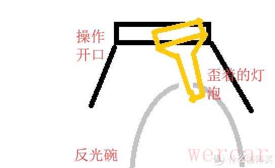 什么问题呢,因为307车灯背后开的洞里,装灯的孔不是居中的,偏向一边。怎么解释呢,算了,我说不清楚,画个剖面图给大家看吧。