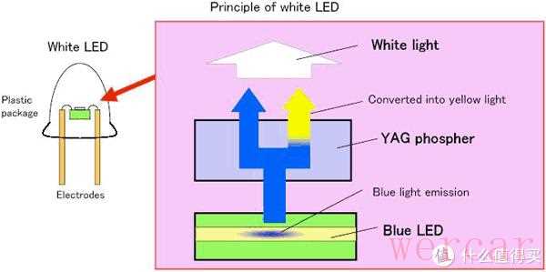 LED光源的结构都一样,发光二极管发出激发光,激发光刺激荧光粉也发光,然后两种光叠加在一起,变成了大家可以看到的光。