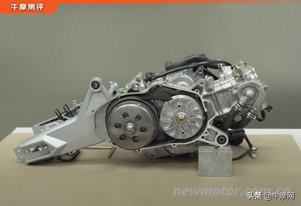 这套PTM结构跟传统CVT一样,依然保持离心式干式离合器结构,不过它设计在车体右侧,尺寸非常紧凑,还加入了独特的“同轴”技术,即后面的从动轮与后轮组为“同轴”设计,但它并不是真正意义上的同轴,而是通过内部的齿轮减速箱转换过来,好处是可以让车体轴距变短,提升操控性,而且齿轮油和机油共用,也就是说保养的时候只需要更换机油就可以了。