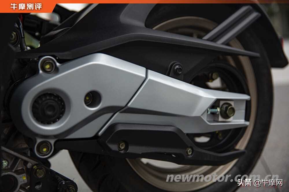 于是乎,光阳KRV 180用上了“固锁式”引擎固定方式,与跨骑车一样,它将发动机和变速箱本体完全固定在车架上,加入独立的后悬吊结构,使两者保持独立关系。为此,光阳还将它引以为傲、旗舰车型AK550上搭载的PTM传动系统下放(这也是KPV180最独特的地方之一,下面会单独细说),这样可以让车辆的重心更加集中,大幅减轻后轮簧下重量,提升操控和运动性。