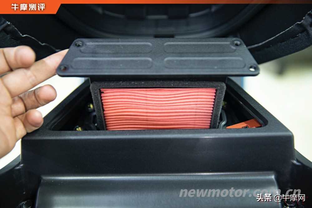 越发觉得KRV这台车的很多设计有意思,如上图,通常这个位置是放电池的,而它却将空滤盒设计在这里,不容易进灰尘,更换也很方便。