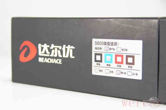 说明纸带上记录着达尔优S600的参数配置与性能特点,从描述中我们得知达尔优S600为玩家提供了多种搭配,轴体产地:国产轴和进口轴,轴体种类:黑轴、青轴、红轴和茶轴,键盘颜色:黑色、白色、黑+金、白+银,多种轴体、颜色选择搭配满足了玩家对于机械键盘的需求,而此次参与评测的便是黑+金国产青轴版本。