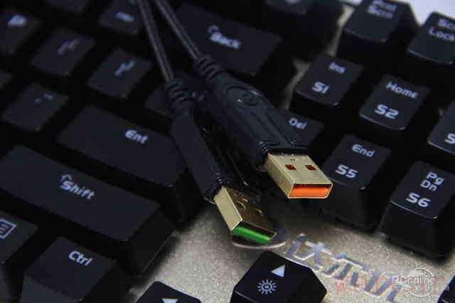 线材方面,达尔优S600 RGB背光机械键盘运用黑色编织线材,抗拉扯性能得到保证。接口方面,达尔优S600 RGB背光机械键盘采用两个镀金USB接口,为键盘的供电稳定和信号良好传输提供了有效保证。此外,两个USB接口非常规地选用了橙色和绿色,两种颜色虽然没有具体标识功能,但这样的设计却也为硬朗金属质感的达尔优S600增添了一分活力。