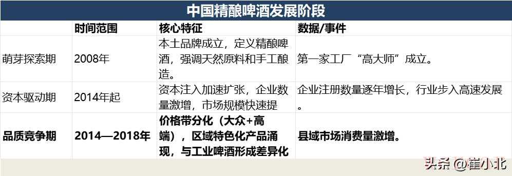 这时市场对精酿啤酒的市场认知低,行业处于小众探索阶段;但是2014年起资本开始大规模注入,老牌啤酒厂加入,行业进入高速发展期,与工业啤酒的差异化竞争格局形成。