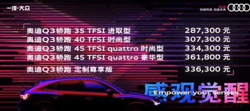 奥迪首款紧凑型跨界轿跑SUV 奥迪Q3轿跑正式上市,售价28.73万-36.18万元,全系共分为5款车型,其中包括定制尊享版车型。