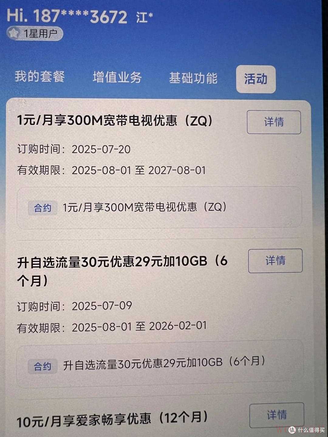 值友 “值友6708131959” 分享:8块保号套装 有一条之前家庭套餐送的300兆宽带。