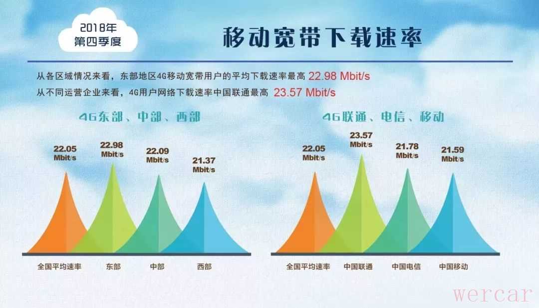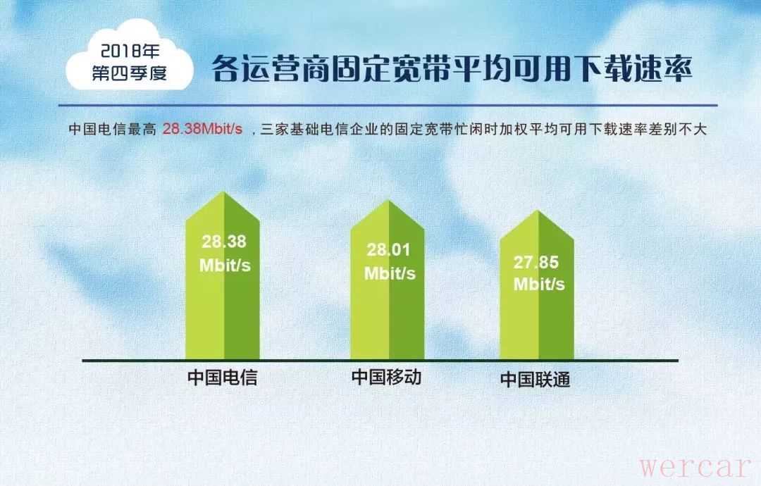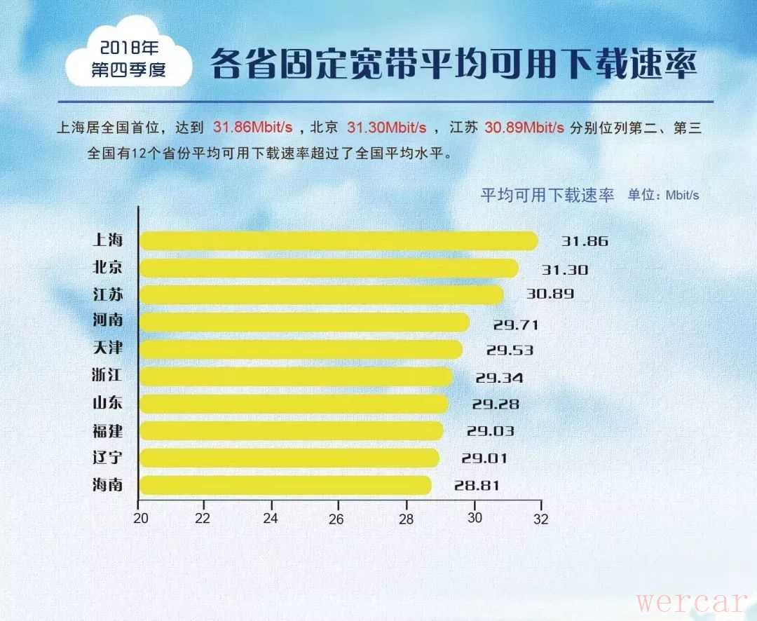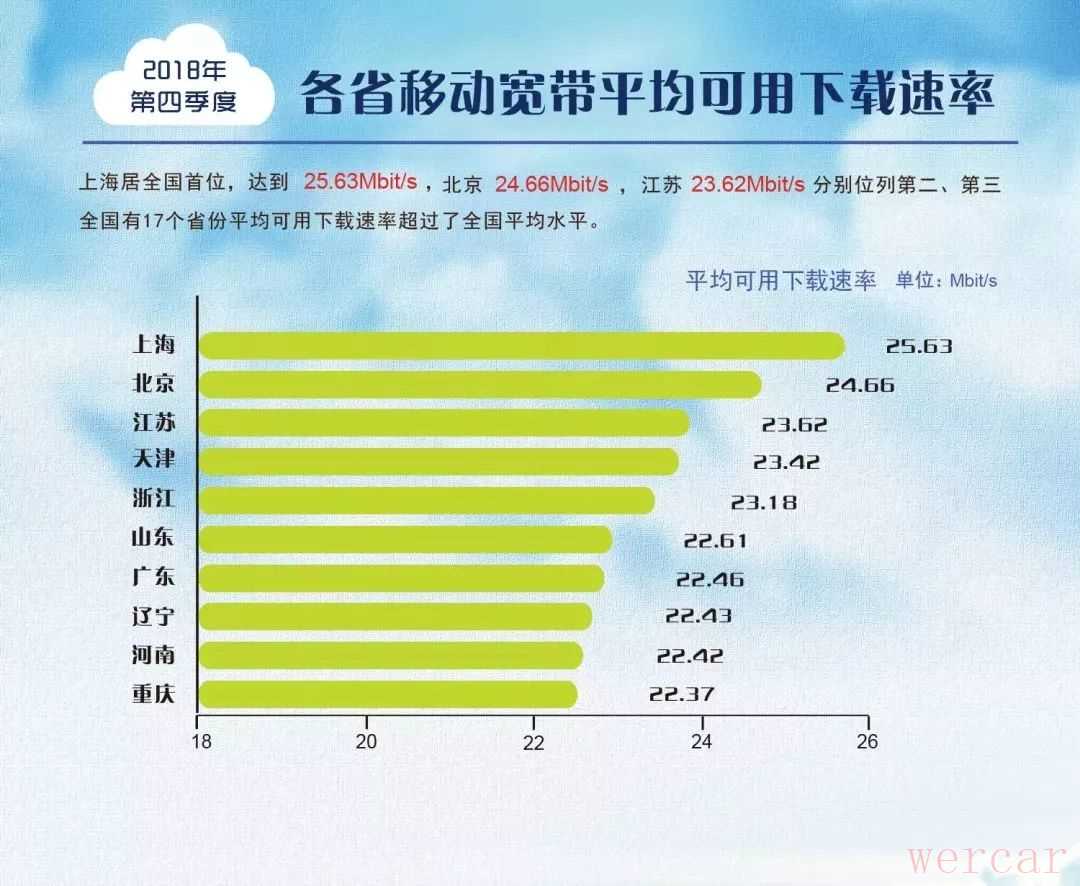 2018年第四季度《中国宽带速率状况报告》发布:固定宽带平均下载速率达到3.51MB/s(28.06Mb/s),上海达到了3.98MB/s(31.86Mb/s),继续位列全国第一。我国移动宽带用户使用4G网络访问互联网时的平均下载速率达到2.76MB/s(22.05Mb/s),上海则达到3.20MB/s(25.63Mb/s),也位列全国第一。电信运营企业中,中国联通的4G网络用户下载速率最高,详↓