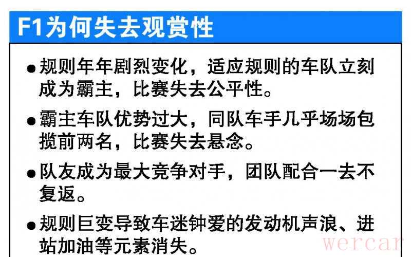 F1竞赛规则改变导致车速变慢,赛情不如以往刺激。更重要的是,赛车规格不断变化,一些适应得好的车队立刻成为比赛霸主,以致赛果毫无悬念。