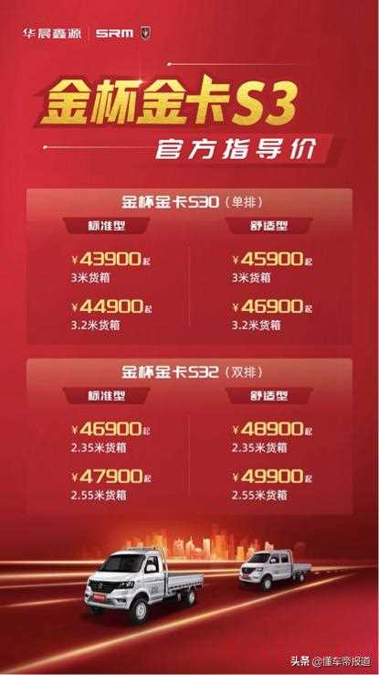 2月19日,金杯金卡S3小卡正式上市,新车发布了包括单、双排在内共计8个不同配置车型,售价区间为4.39-4.99万元。