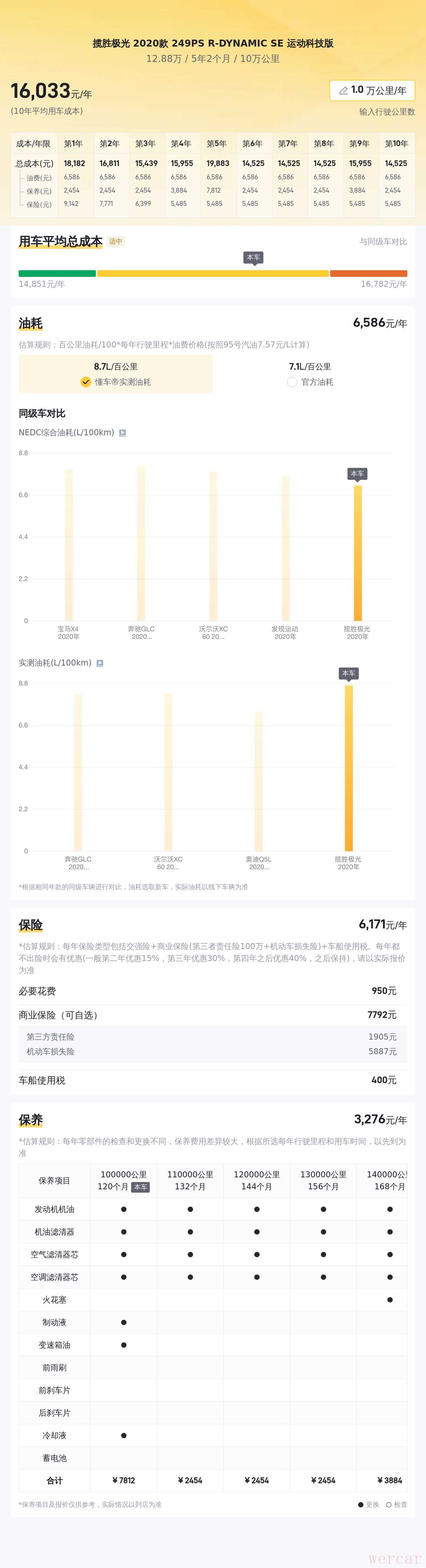 揽胜极光 2020款 249PS R-DYNAMIC SE 运动科技版的10年平均用车成本是15687元/年,而同级车的最低是15687元/年,最高是20810元/年,所以它的用车成本较低。