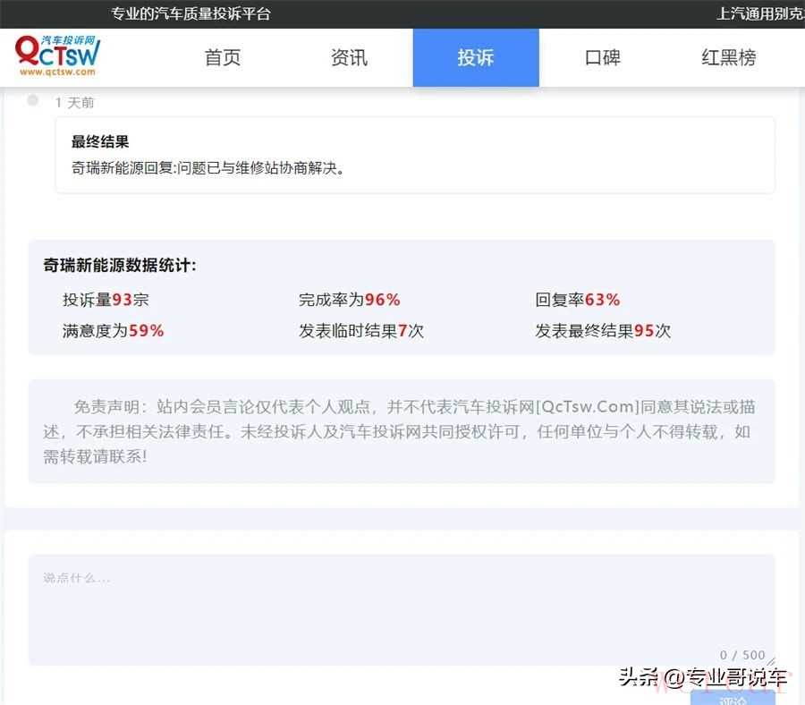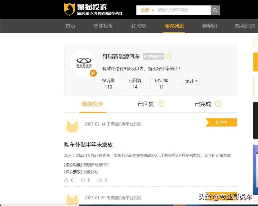 究其原因,与奇瑞新能源过去一年投诉量高企的现象或许脱不开干系。据第三方汽车投诉平台车质网数据,2022年全年,有关奇瑞新能源的投诉量超过了400宗。与此同时,在其他投诉平台,奇瑞新能源的投诉量也并不低,黑猫投诉数据显示,奇瑞新能源累计投诉量为119宗;汽车投诉网数据显示,奇瑞新能源累计投诉量为96宗……