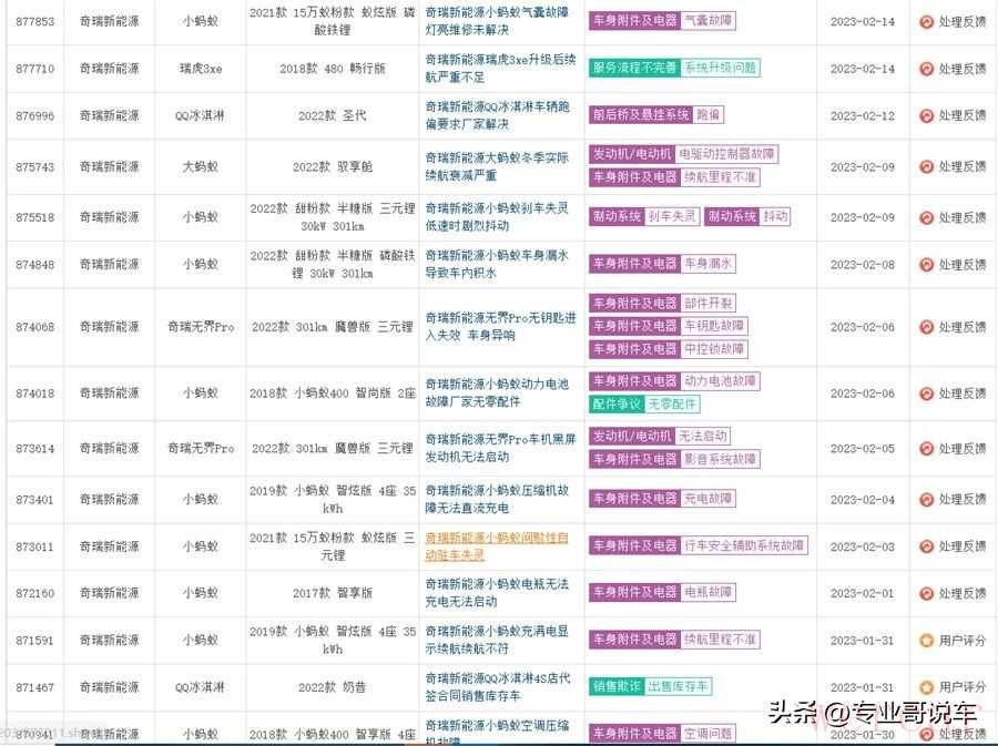 值得关注的是,关于奇瑞新能源旗下车型的投诉,有不少都是影响车辆正常使用甚至威胁行车安全的投诉。其中,奇瑞小蚂蚁问题基本集中在充电故障、动力电池故障、动力系统故障、电瓶故障、刹车失灵等。奇瑞QQ冰淇淋则出现不少关于动力电池故障、转向系统异响、动力系统故障、空调问题、漆面起泡开裂及其他各类销售服务方面的问题。