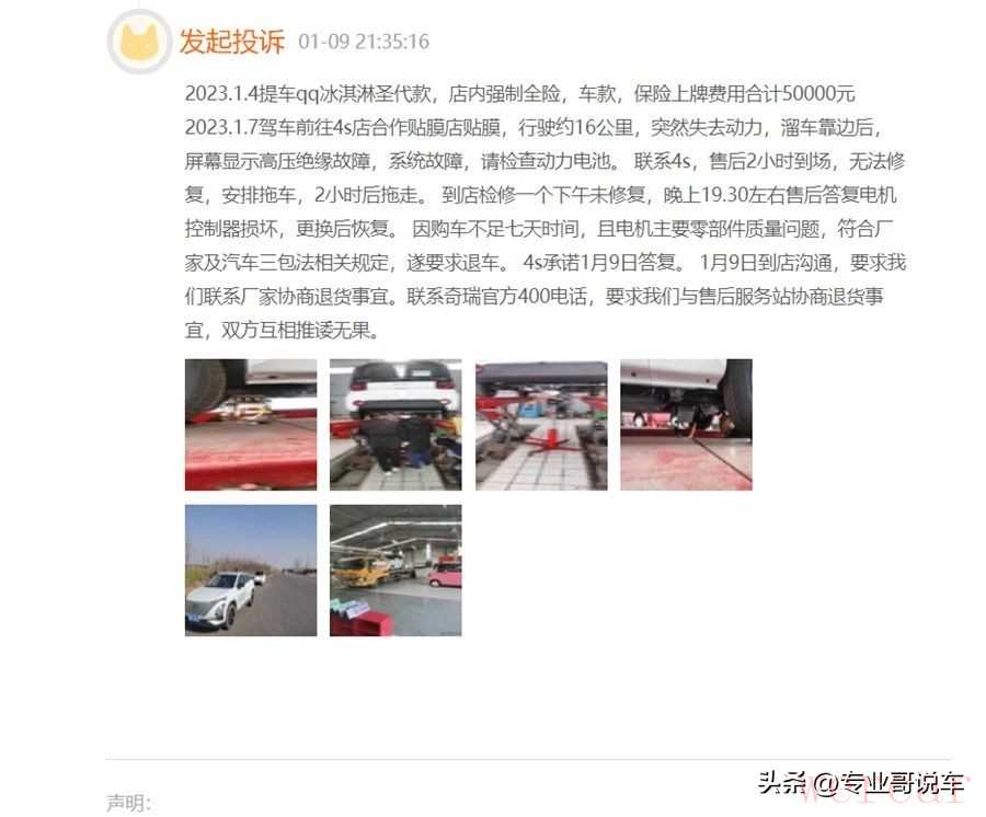 甚至,有不少车主在新车阶段就遇到了糟心事。黑猫投诉中一位奇瑞QQ冰淇淋(圣代)车主反映称,其在提车不足三天后,在贴膜过程中,行驶约16公里后突然失去动力,屏幕显示“高压绝缘故障,系统故障,请检查动力电池”。要知道,这可是提车不足72小时的新车啊,就这样出现了致命性故障。