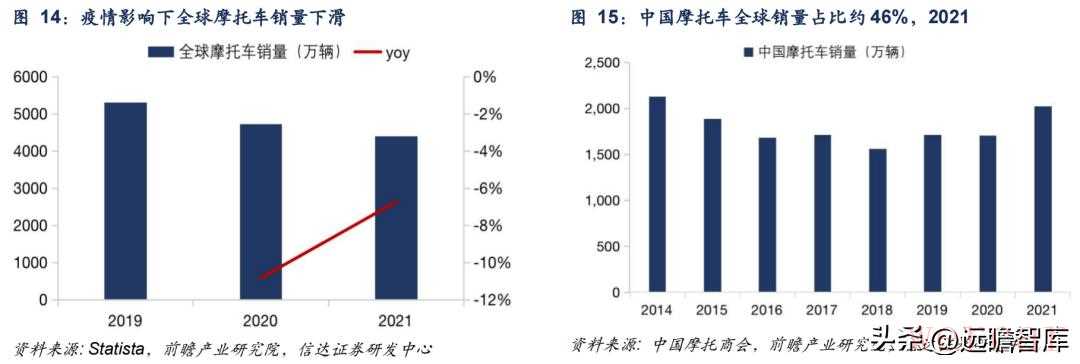 Statista数据显示,全球摩托车销量由2019年的5293.47万辆下滑至2021年的4400万辆。其中我国是全球最大摩托车市场,摩托车销量于2018年达到行业低谷后,逐渐波动增长至2021年的2019.48万辆,约占全球摩托车销量的45.90%,其次是印度,东南亚和南美等以小排量摩托为主要出行工具的国家位于第二梯队。