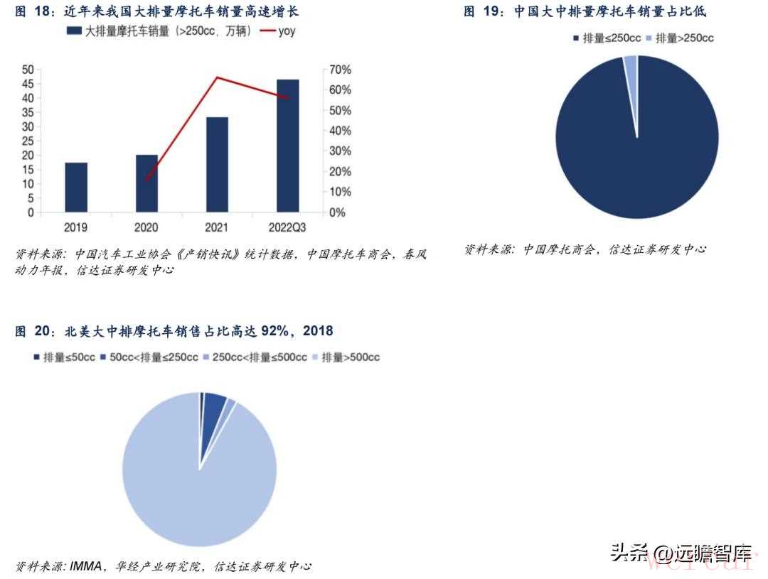 以休闲娱乐为主的250cc及以上大排量摩托车增速较快,中国摩托车商会数据显示,2022年1-9月我国摩托车销量为1681.21万辆,同比下降13.13%;然而,大中排量摩托车销量达到46.50万辆,同比增加55.68%,实现逆势增长。目前,我国大中排量摩托车占比较小,2022年1-9月销售占比仅为2.77%,对比2018年北美大中排量摩托车92%的占比,差距较大,未来仍有较大发展空间。