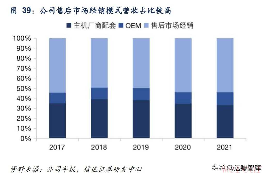 经销网络的建立为自有品牌铺设销售渠道,进一步加速自主品牌建设,提高产品影响力。目前,公司售后市场经销模式占比最高,2021年占营收比重高达54.12%。