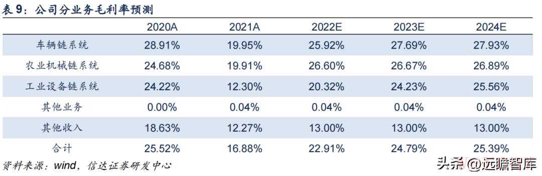 1)车辆链:车辆链系统包括摩托车链和汽车链。国外摩托车后装市场需求大,叠加国内大排量摩托车渐成潮流后购买量提升,摩托车链市场广阔。同时,公司积极拓展汽车链国内后市场,由于基数较小,汽车链增速预期较快,摩托车链有望保持稳定增长。我们预计2022-2024年公司车辆链系统实现营收8.83/10.80/13.08亿元,同比增长20.10%/22.37%/21.13%。