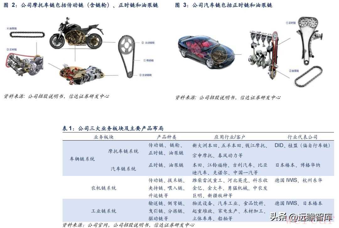 目前,公司主要产品为正时链、传动链和链轮,主要业务板块为车辆链系统、农机链系统和工业链系统。其中,车辆链产品主要包括传动链、正时链和油泵链;农机链系统覆盖用于动力传动装置的传动链系统和用于收割装置的收割输送链系统;工业链下游细分使用场景众多,主要产品为输送链、倍速链、侧弯链、曳引链等。