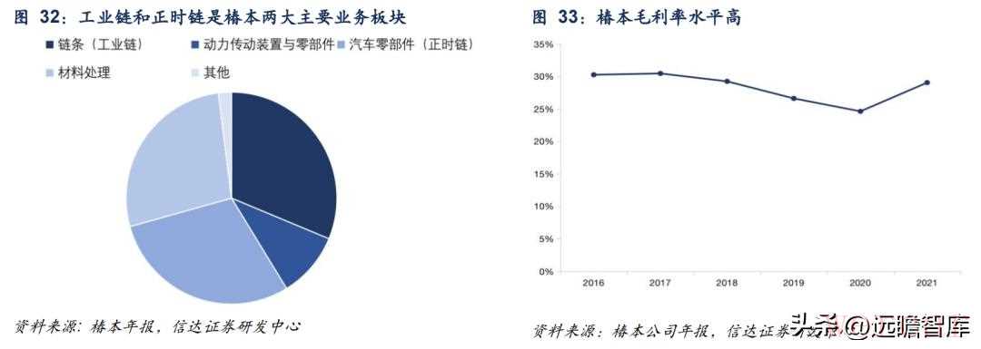 据2020年年报披露,椿本链条(工业链)业务实现营收约30.65亿元,以16%的市占率位居全球工业链市场第一;汽车零部件(正时链)业务营收约为28.85亿元,以37%的市占率位居全球正时链市场第一。