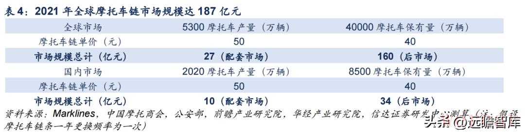 (1)2021年全球摩托车链市场达187亿元。据Marklines预计,全球主要国家摩托车2021年产量预计达5300万辆,每套链系统单价50元,我们测算,2021年全球摩托车链系统配套市场为27亿元;2021年全球摩托车保有量估算约4亿辆,若一年更换一次链条,链条单价40元,我们预测,2021年全球摩托车链后市场规模为160亿元。