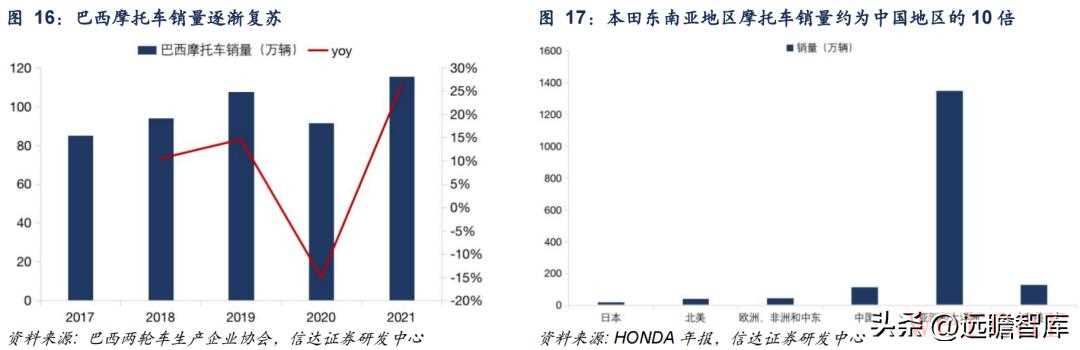 虽然全球摩托车销量小幅下滑,巴西、东南亚等以小排量摩托车为主要通勤工具的国家需求回暖。据巴西两轮车生产企业协会数据,经过销量短暂下滑后,2021年巴西摩托车销量达115.61万辆,yoy26.32%。