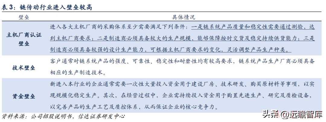 市场认为链条行业壁垒不高,我们认为,链条行业属于精密加工行业,多个工艺环节的微小差距造成了最终产品质量的较大差异,know-how 积累明显。同时,行业优秀公司需要同时具备产品质量过硬、交付能力强和性价比等多重优势,进入壁垒较高。