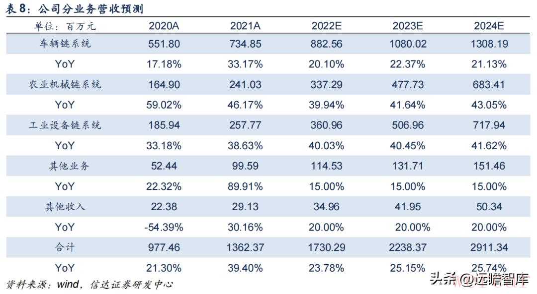2)农业机械链:近年来,“粮食安全”和人口老龄化问题驱动农业机械市场规模扩大、保有量增加。公司作为农业链系统的龙头,已与国内多家知名厂商建立长期稳定合作。随着农业机械化率的不断提高,未来该业务板块有望呈现高速增长态势。我们预计2022-2024年公司农业机械链系统实现营收3.37/4.78/6.83亿元,同比增长39.94%/41.64%/43.05%。
