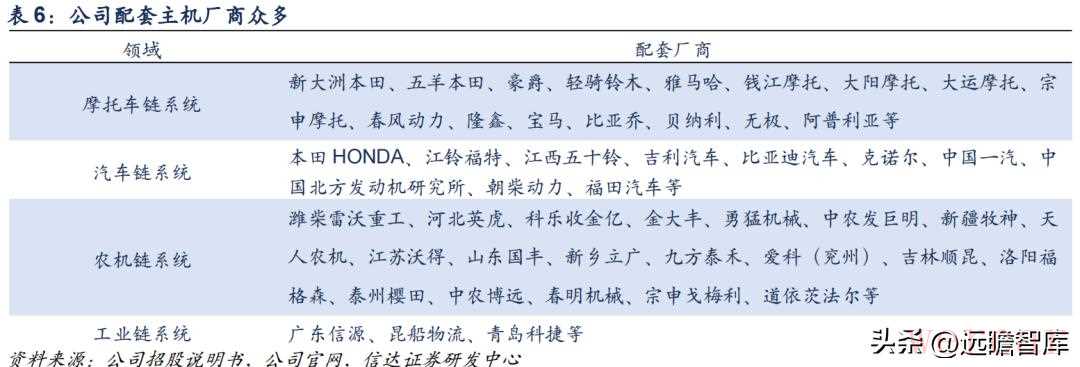 凭借精湛的工艺和高效的营销能力,公司已与部分国内外优质的摩托车、汽车、农机以及工业设备主机厂商建立良好合作关系,为其提供配套原装链系统产品。此外,OEM模式下,公司按照海内外优质品牌商的标准和特殊需求提供高品质链系统产品,不断提高技术水平。