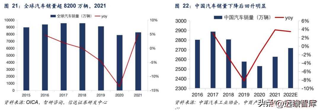 2018年起,全球汽车销量不断下降,2021年小幅增加至8268.48万辆。中国作为全球最大的汽车生产国,疫情管控下,制造业生产逐渐恢复正常,叠加新能源汽车推广等影响,据中国汽车工业协会数据,2021年我国汽车销量达到2628万辆,2022年有望增至2718万辆,汽车链系统产品随之放量。
