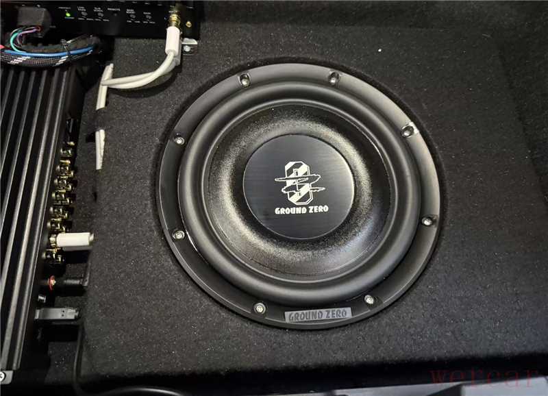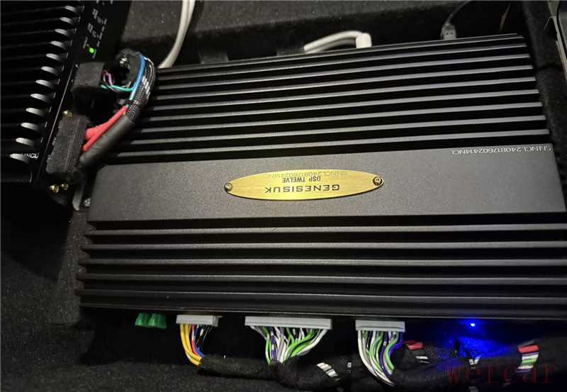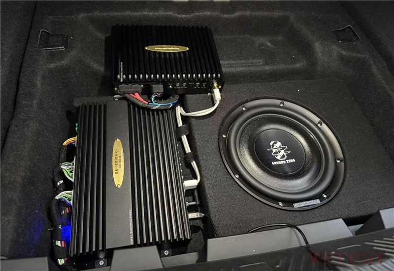 英国创世纪功放驱动德国零点RW250低音喇叭,由创世纪DSP12 DSP功放做整个声场的调控。低音定制了箱体,与功放和DSP一起隐藏式安装在尾箱底部,盖上底板后就完全看不出改装的痕迹,不影响尾箱的实用。
