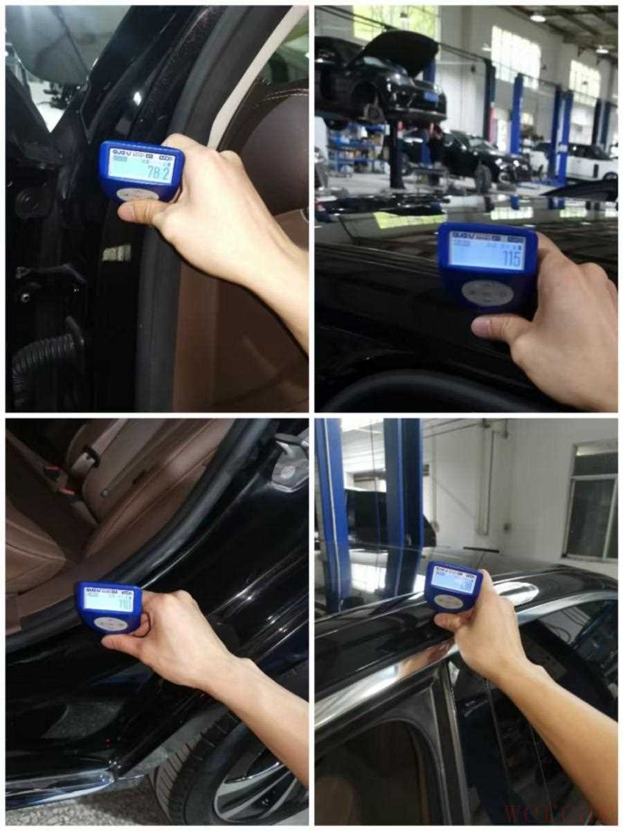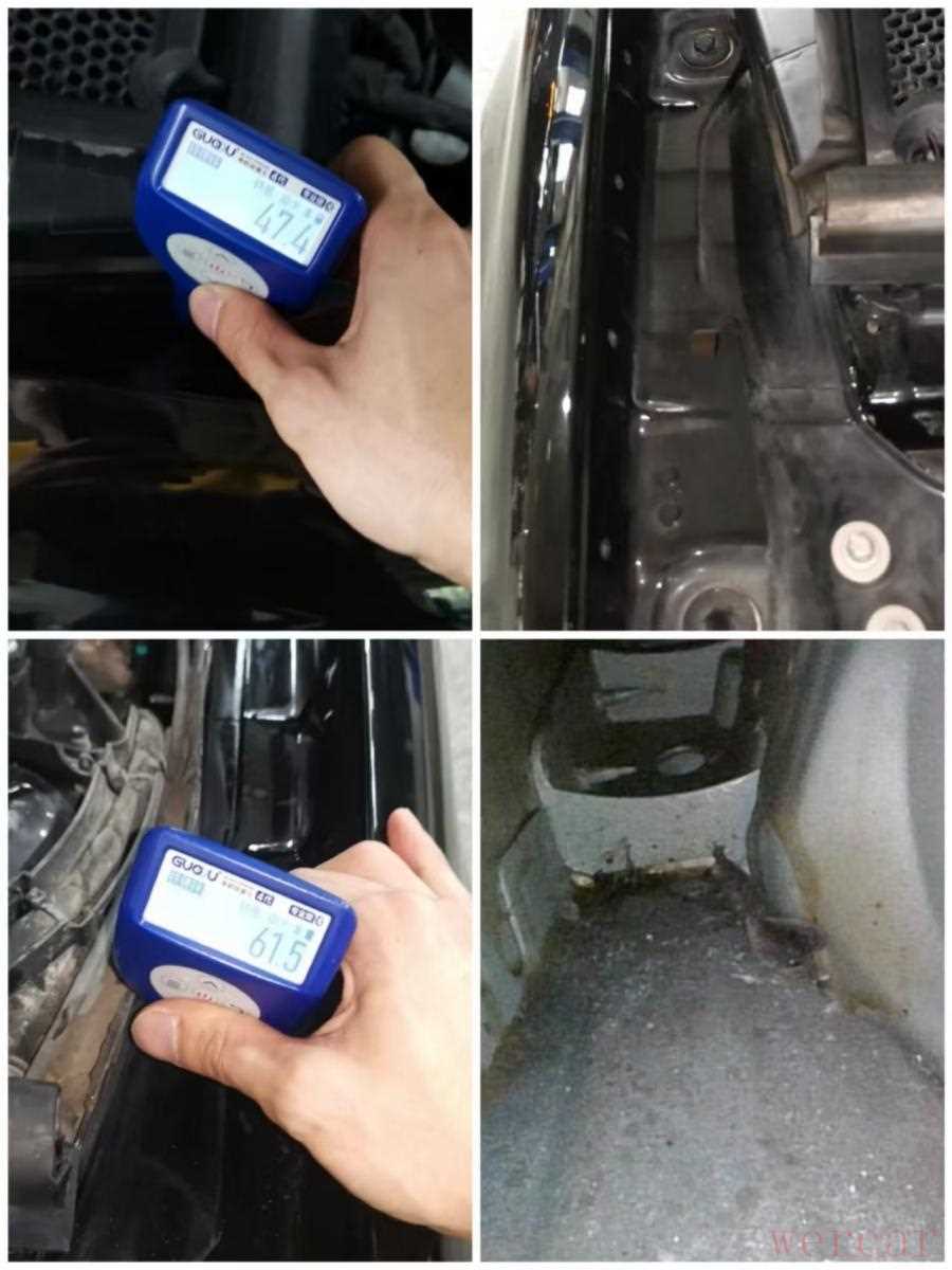 往后看车身,车身喷漆钣金的地方不少,才开三年的车,前车主的技术真不咋地啊!好在重要的ABC柱、上下边梁和前后门框都没有损伤,算是挽救了基本的颜面。