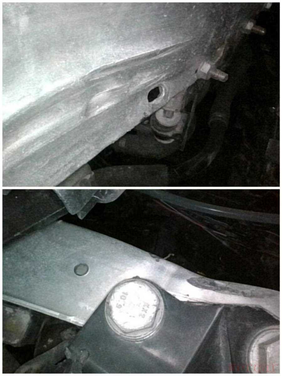 往里面看前防撞梁,梁体左侧都弯曲变形了,螺丝也都全部拆过,竟然没有更换,是不是修理厂把钱黑了?