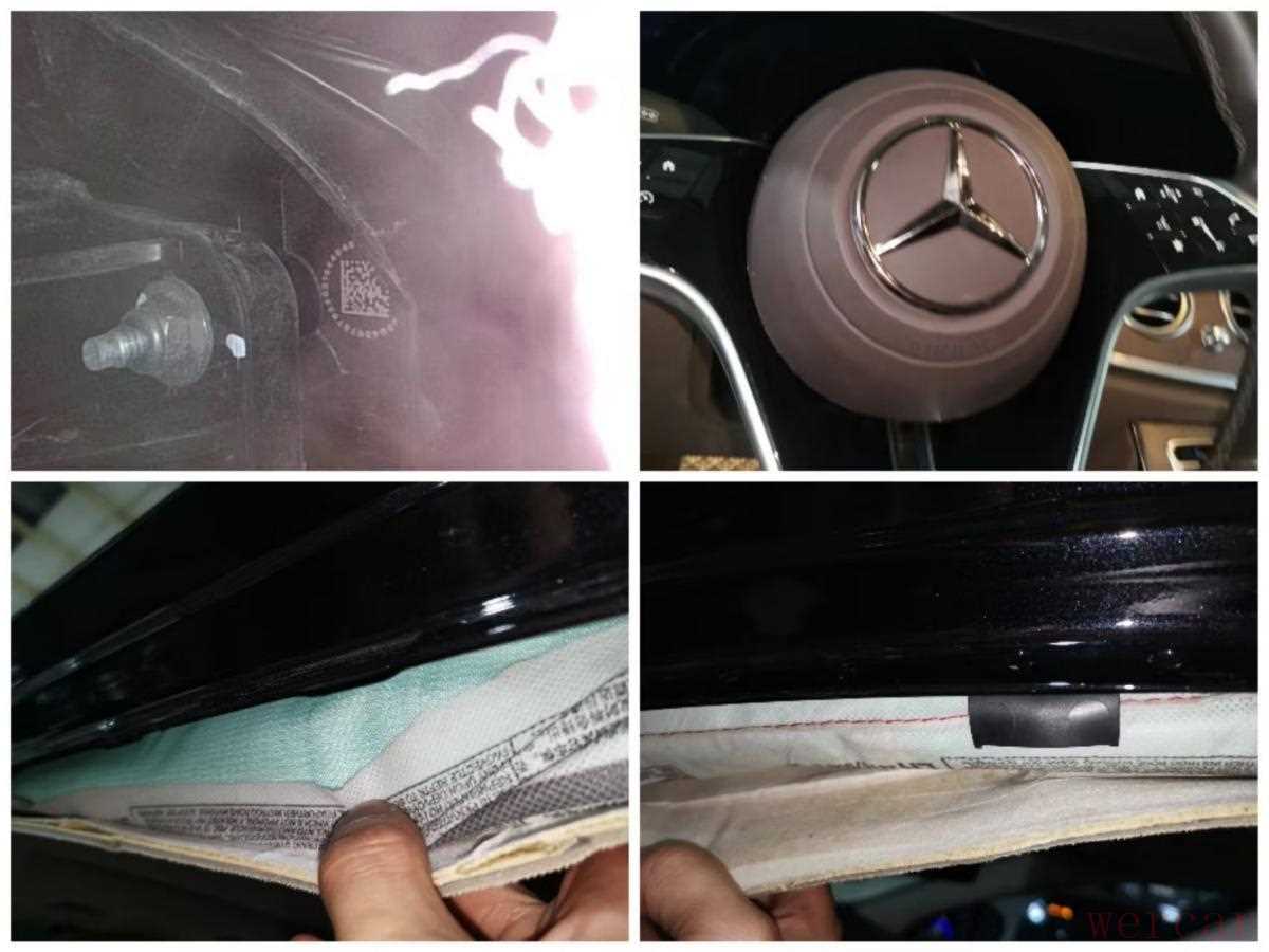 车头事故的损伤不是特别严重,但足以触发气囊弹爆,看主驾气囊的螺丝,确实有拆装拧动痕迹;前挡风玻璃也更换了,逻辑能对上;左后方的事故也触发了侧气帘,但后期的维修就不敢恭维了,侧气帘没有更换,只是把原来炸过的材料塞了回去,这东西已经失效了!