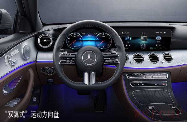 在普通版E级中,三幅方向盘设计源自奔驰经典车型300SL的鸥翼车门,配以高亮的钢琴漆光泽,同时搭载电容传感技术,驾驶者通过可实现手指滑动、按压等操作控制仪表盘和中控屏。 而运动轿车采用的则是双翼式运动方向盘。