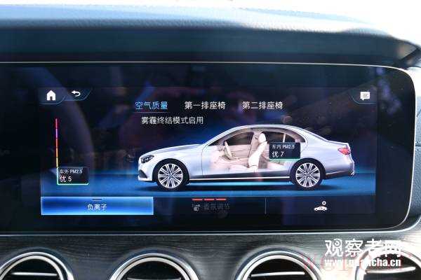 坐在E级内部,在负离子与香氛系统的作用下,基本感受不到内饰材质带来的异味,值得一提的是奔驰的雾霾终结模式,可实现99%的PM1.0-5.0可吸入颗粒物过滤,并实时监测空气质量,一旦发现有害物质,便可开启最高30分钟的内循环模式。