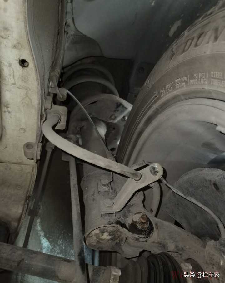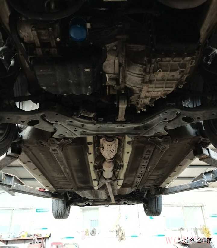 车商院子里就有举升机,很快就把底盘升了起来。检测底盘的重要性就不用了三杠做重复了,很多时候在上面看不到什么异常,却在下面发现了问题。