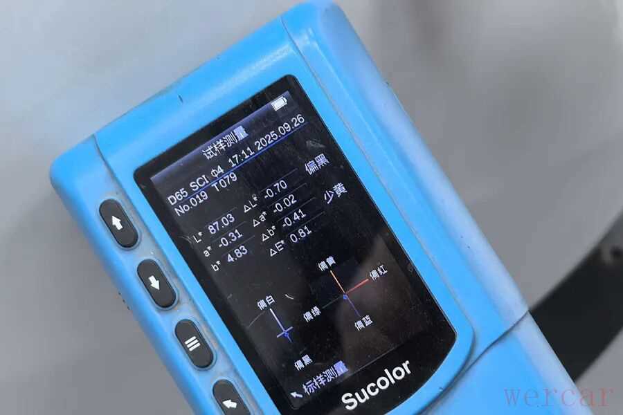 经过测试,最大色差值位于前保险杠处,色差值为0.81ΔE,比基准点偏黑少黄。从数值上来看,这辆车的喷漆工艺质量控制得比较不错!