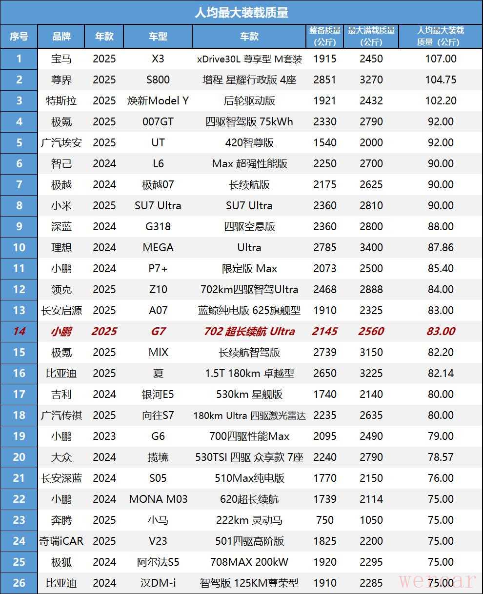 我们这辆车的整备质量为2145千克,最大满载质量为2560千克,计算得出这辆2025款 702 超长续航 Ultra的人均最大装载质量为83千克,超出标准8千克。