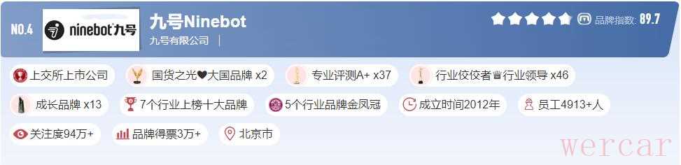 虽然九号只是成立2012年,属于较晚一批成立的电瓶车品牌,但九号是电瓶车为数不多的上市公司,它是智能车行业佼佼者,获得专业评测A+37项,并且在7个榜单都有它的身影,比如电摩、电动自行车、电动滑板车等。