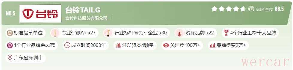 台铃成立2003年,是标准起草单位之一,用户关注度100万+,在4个榜单都有台铃品牌的存在,分别是:电瓶车品牌榜第5名,电动自行车品牌第3名,三轮车品牌榜19名,深圳市企业品牌榜。