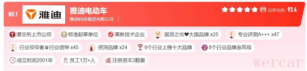第1名:雅迪,品牌指数:93.4分