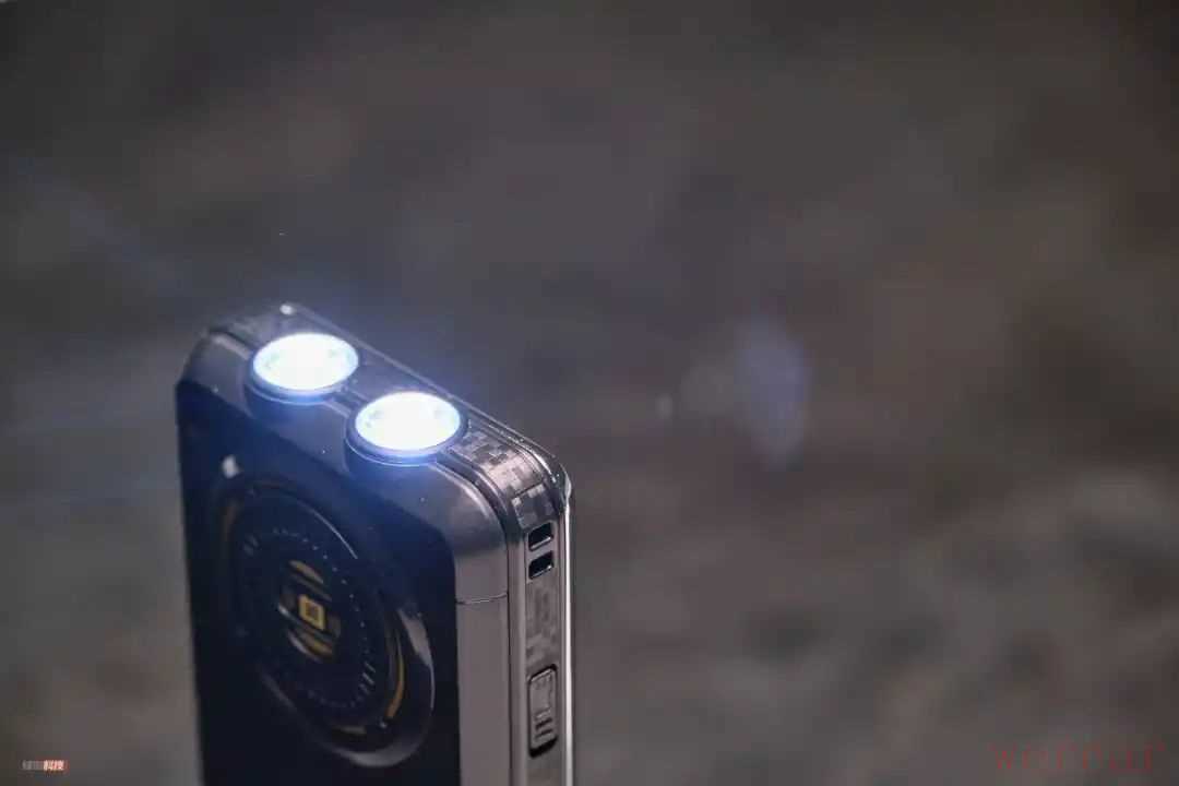 机身侧面有一个滑动的开关按钮,控制手机顶上的两颗手电筒。