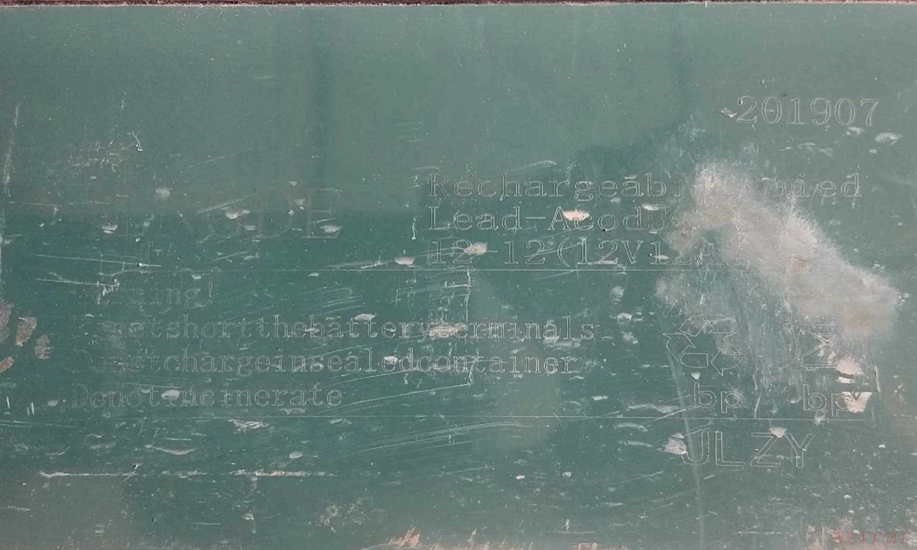 正规厂家生产的电瓶,基本信息都在最显眼的地方。上图是假电瓶的喷码,全是洋码子,还喷在最容易磨损的侧面。而且喷码也是相当的凑合,给人一种很不正规的感觉。