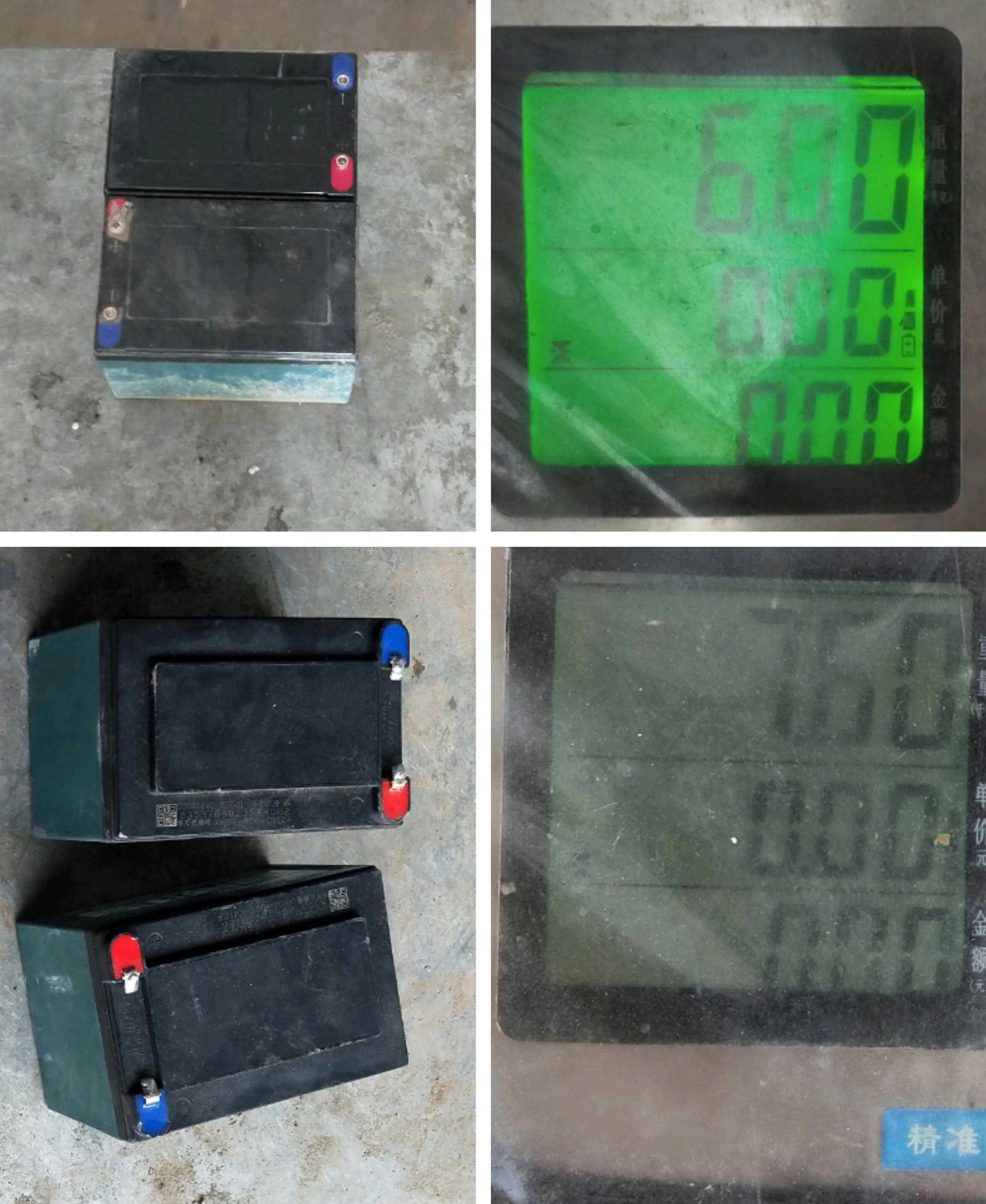 如图,上面那两块电瓶是假电瓶,它的重量是6kg;下面那两块电瓶是新国标电瓶,它的重量是7.6kg(重量轻了点)。单块重量轻了1.6斤,和大瓶冰红茶的重量差不多。