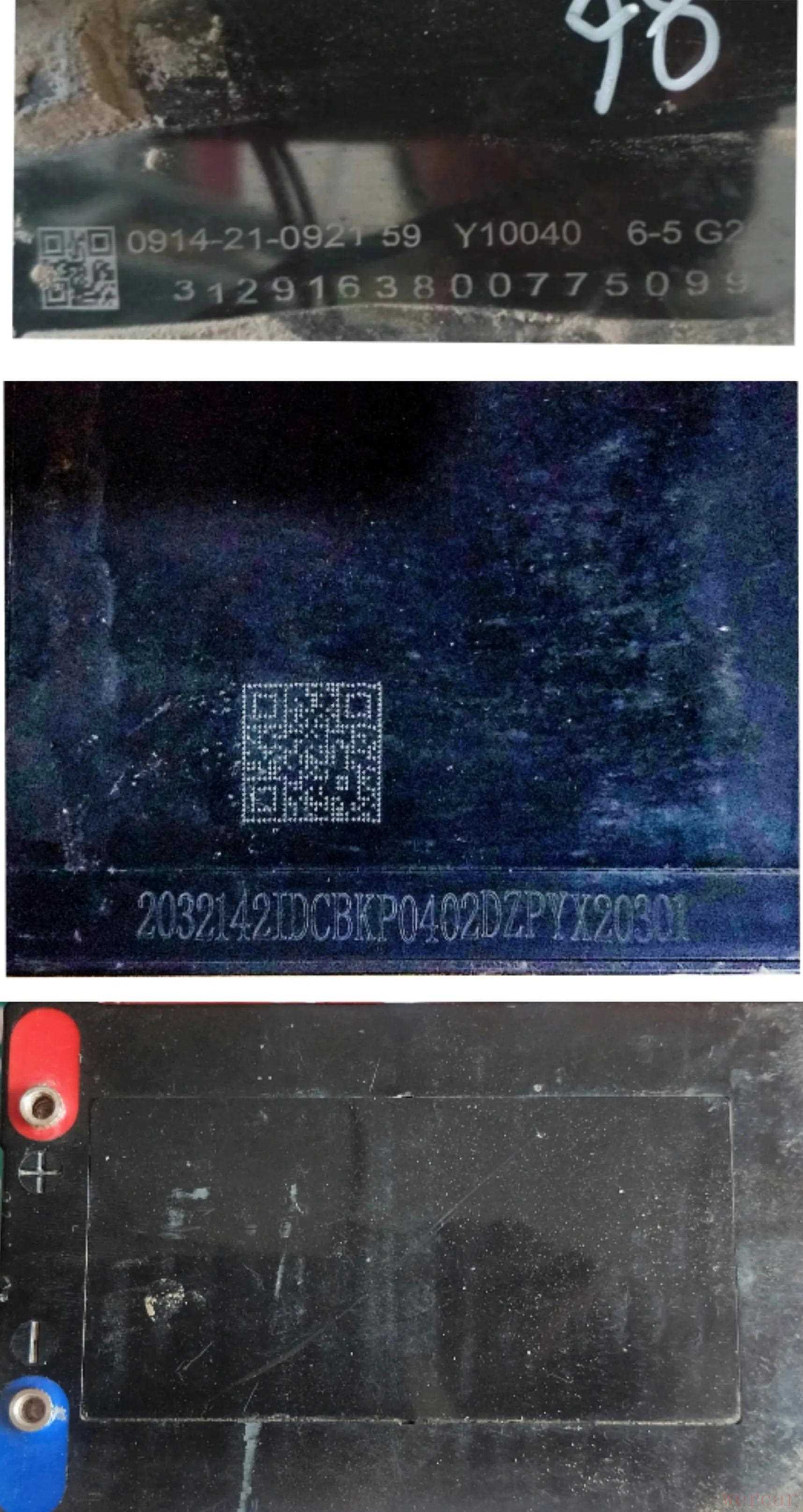 如图,最上面的两张图片分别是超威和天能的正面激光喷码,喷码除了电瓶的基本信息外,还有一个二维码式的条形码(不是二维码)。下面那张图片是假电瓶的正面,上面什么喷码都没有(连一个字都没有)。有激光喷码的不一定是真电瓶,但是没有激光喷码的一定是假电瓶。