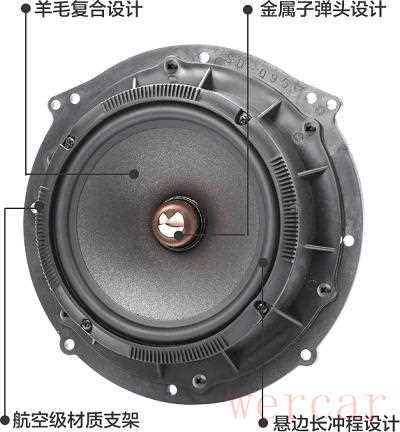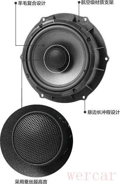 定制前门中低音扬声器和定制后门同轴扬声器都采用羊毛混合聚丙烯捞制压工艺制成,频率平稳,有良好的解析力。不仅如此,它们还采用了航空级材质支架,悬边长冲程的设计也使扬声器更耐冲击、更耐疲劳,在高温工作下收放自如。