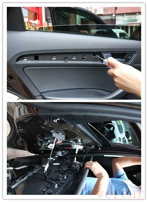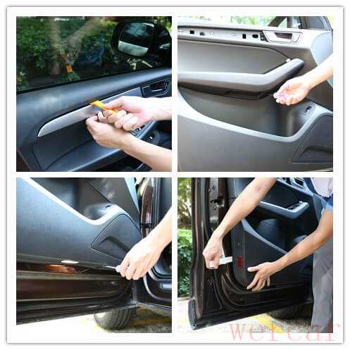 3. 用翘板将内饰条翘开后,卸下固定门板螺丝,然后拆开后门