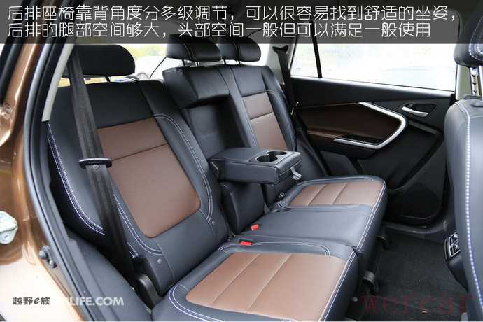 前后排座椅采用黑/棕色真皮包裹,座椅造型整体偏向舒适。皮质柔软填充物厚实,乘坐舒适度很高。后排座椅可以实现靠背角度调节,可以让后排乘客调节到更加舒适的坐姿,这也是紧凑级SUV相对于B级车的优势所在。