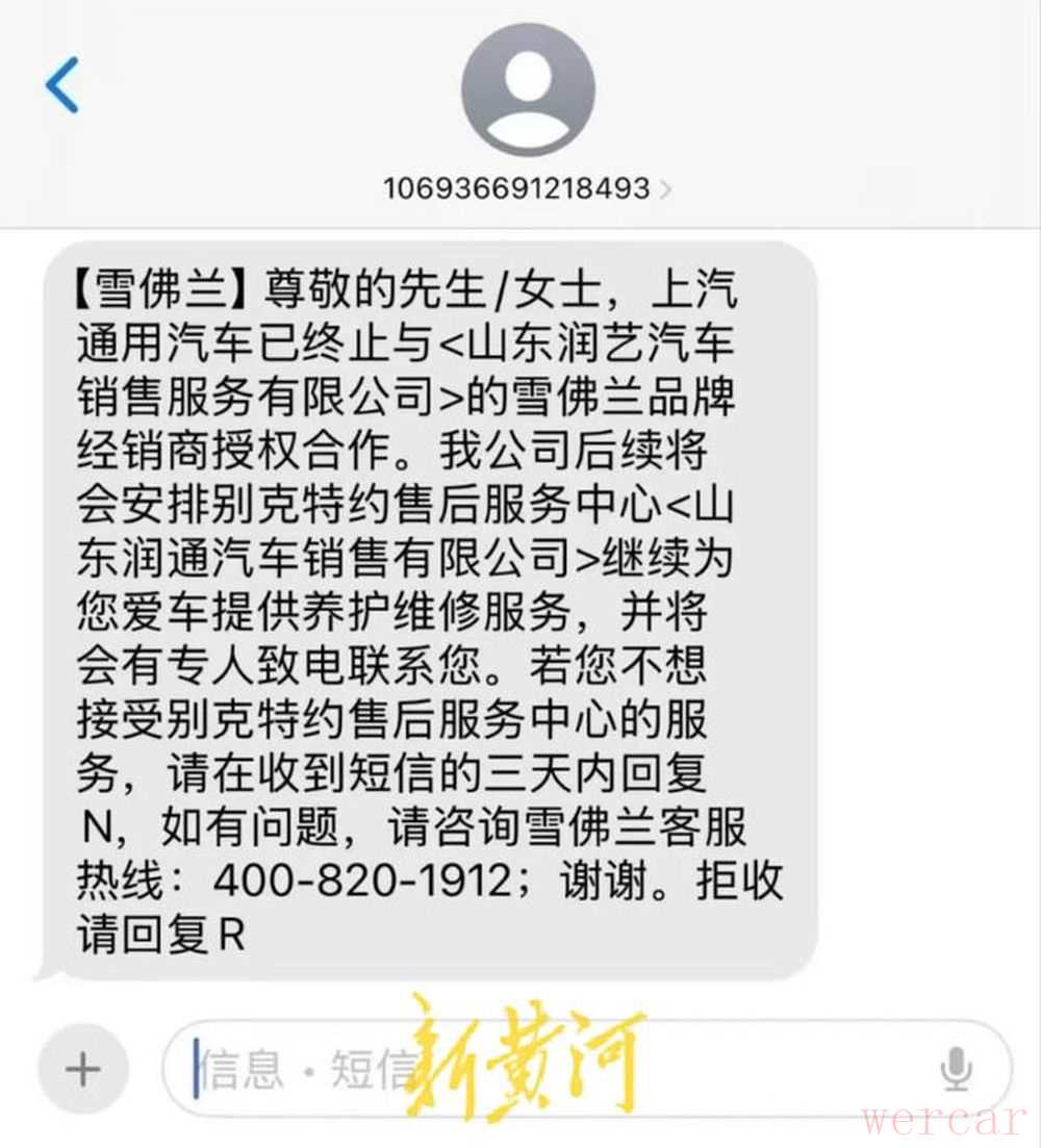 3月26日,该车主收到一条雪佛兰官方短信,其称“上汽通用汽车已终止与山东润艺汽车销售服务有限公司的雪佛兰品牌经销商授权合作,后续将会安排别克特约售后服务中心提供养护维修服务,并将会有专人致电联系”。截至记者发稿时,该车主未接到相关电话。