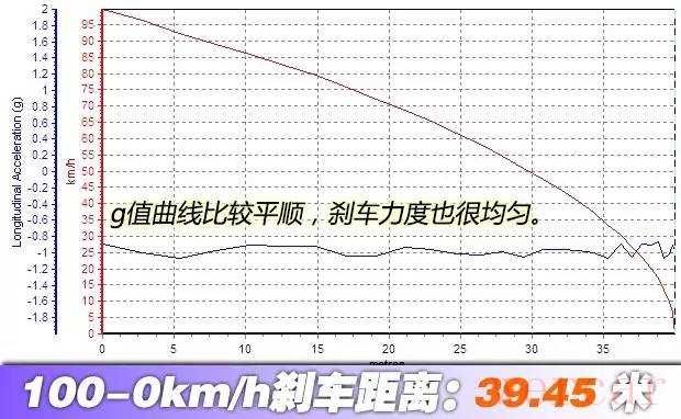 跑得快还得刹得住,最后经测试,刹车成绩不错,制动力平均而且稳定,多次连续刹车测试也无热衰减现象,最终平均成绩为39.45米。